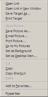 Het 'normale downloaden' van bestanden gaat heel simpel. Stel u bezoekt een internetpagina met een mooi plaatje. Als u op het plaatje gaat staan met uw muis, de 'andere' of 'context' knop indrukt (bij rechtshandige mensen is dit de rechter muis knop), ziet u meestal een lijstje verschijnen vergelijkbaar met het hiernaast afgebeelde plaatje.