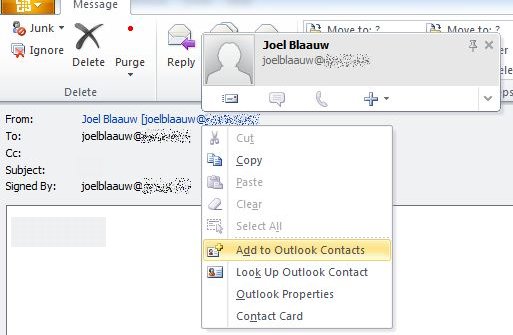 Als je, in Outlook, deze gebruiker vervolgens toevoegd aan je Outlook Contactenlijst zal ook automatisch het 'certificaat' worden opgeslagen, en kun je de volgende keer 'versleutelde' berichten met die persoon uitwisselen.